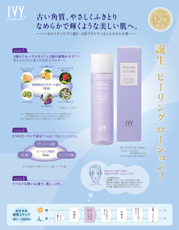 《NEW》ピーリングローション登場♪ 投稿日 2026年3月13日 著者 reisakamo カテゴリー お知らせ 「古い角質をやさしくふきとることで、輝くような美しい肌へ。」 4種類のフルーツエキス(保湿成分:キウイエキス、グレープフルーツ果実エキス、レモン果実エキス、ヨーロッパキイチゴ果実エキス)と、2種の植物エキス(保湿成分:サボンソウ葉エキス、ブドウ葉エキス)配合で肌をなめらかにし、角層を整えます。 洗顔後のお肌を優しく拭き取るだけ♪お試しいただいた方から、「肌がすべすべになった!」「化粧のりが良くなった!」とご好評です。 この記事を書いた人 reisakamo 記事一覧 ウェブサイト